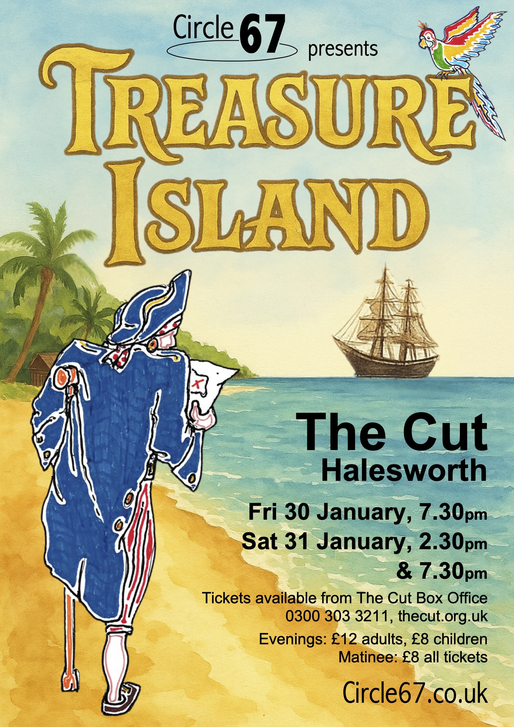 Treasure Island A4 posterJoin us for a thrilling voyage of discovery, danger and daring, as Robert Louis Stevenson’s Treasure Island is brought to life on stage at The Cut this January. The classic adventure in which young Jim Hawkins finds a treasure map in a dead pirate’s sea chest, and sets out with Captain Smollett, Squire Trelawney and Doctor Livesey to find the island where the treasure is buried.